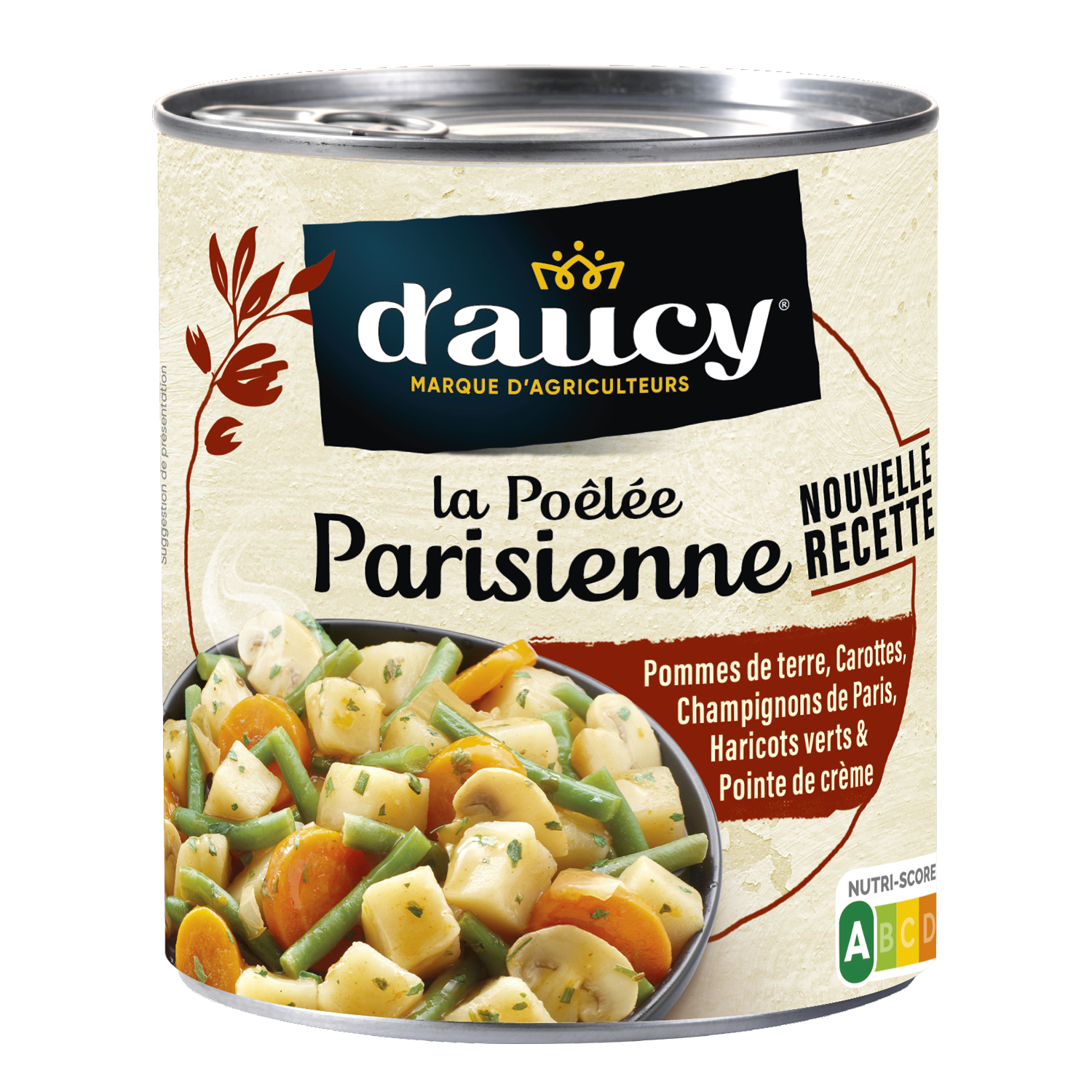 Pommes de terre en cubes (39%), carottes en rondelles (16%), haricots verts coupés (14%), eau, champignons de Paris entiers (10%), lardons fumés (3%) (poitrine de porc, sel, antioxydant : erythorbate de sodium, conservateur : nitrite de sodium), graisse de canard (1.2%), persil, sel, ail, arôme naturel, oignon grillé poudre, poivre blanc.